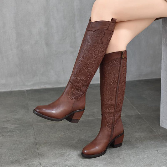 Retro Embossed High-Heel Boots